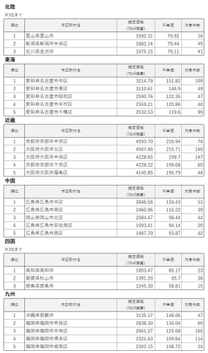 各エリア5位まで。ただし、「北陸」「四国」は対象件数が15件未満の市区町村が多いため3位までの掲載。