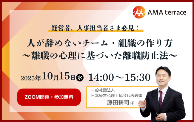 みらいコンサルティンググループ(本社:東京都中央区、代表:久保 光雄 岡⽥ 烈司)は、2025年10月15日にセミナー『 人が辞めないチーム・組織の作り方~離職の心理に基づいた離職防止法~』をWEBにて開催します。