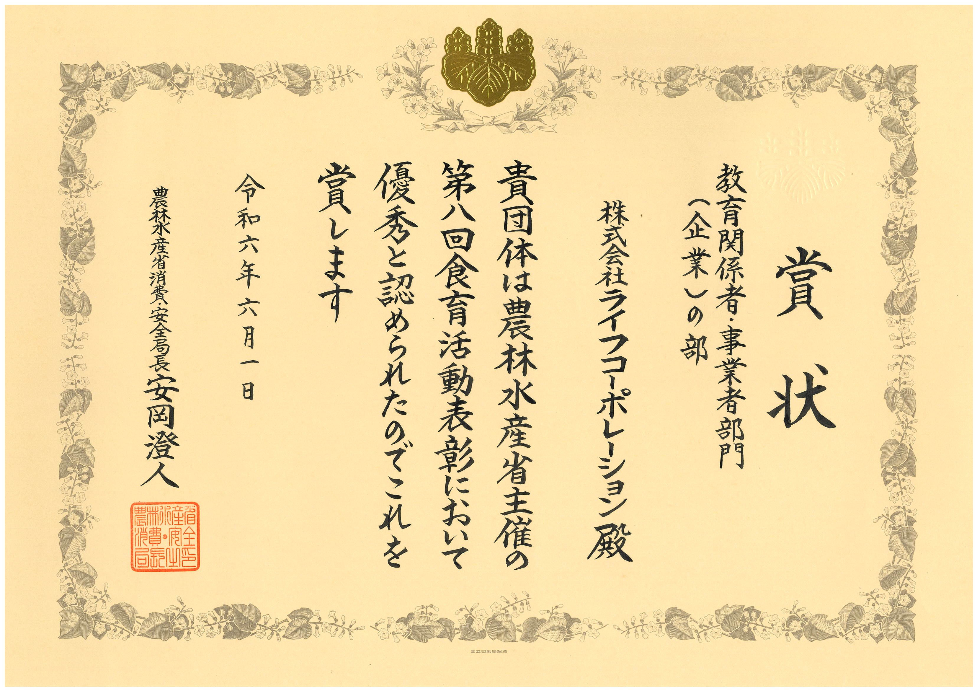 農林水産省主催「第8回 食育活動表彰」において「ライフ出前授業・親子食育体験教室」の活動が『消費・安全局長賞』を受賞!