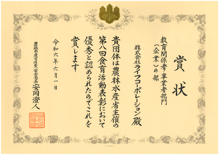 “おいしい” “ワクワク” “ハッピー” をお届けするライフコーポレーションは、「第8回 食育活動表彰(主催:農林水産省、運営:第8回食育活動表彰運営事務局)」の教育関係者・事業者部門において、当社の「ライフ出前授業・親子食育体験教室」の活動が『消費・安全局長賞』を受賞いたしました。