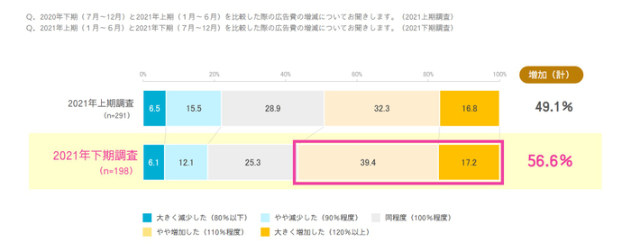 2021年下期インターネット広告費は「増加した(大きく増加したを含む)」の回答が半数を超え、2021年上期と比較して市場環境が大きく改善している。