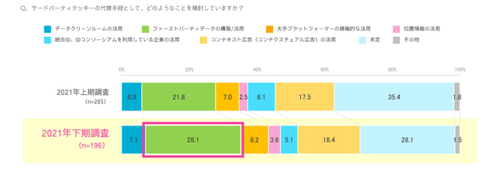 対応内容では、「ファーストパーティーデータの構築・活用」が全体の28%と最も高く、「コンテキスト広告の活用」が18%と続いた。