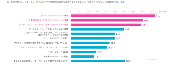 「ファーストパーティーデータ構築」の注目度は依然として高い。加えて「企業戦略含めたビジネスコンサルティング領域」や「Eコマース / ソーシャルコマース支援、または自社での展開」が重要だという回答が多かった。