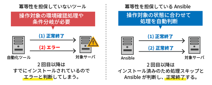 AnsibleではPlaybookを変更しない限り何度実行してもサーバなどの状態は変更されません。このように、ある操作を何度実行しても常に結果が同じになる性質をAnsibleでは冪等性と呼びます。例えば、パッチ配布ソフトウェアのインストール時に、既に適用済みであればAnsibleが処理をスキップするため、コーディング時に必要な対象環境の確認処理や、その後の条件分岐などが不要です。