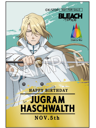 イベント開催期間中に誕生日を迎えるキャラクターをお祝いする限定イベント。第1弾は11月5日に誕生日を迎えるユーグラム・ハッシュヴァルトと11月6日に誕生日を迎える石田雨竜のお祝いに、期間中に来場された方には、バースデーイベント限定スクエア缶バッジをプレゼントいたします。