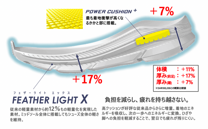 ミッドソールには、従来の軽量素材から約12%※の軽量化を実現した弊社史上最軽量※素材「FEATHER LIGHT X(フェザーライト エックス)」を搭載。軽量性を維持しつつ、体積と厚みをアップさせることで、異次元のクッション性を実現しました。