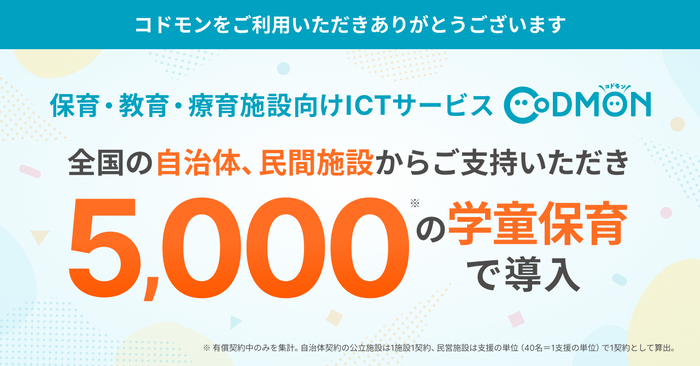 株式会社コドモン(本社:東京都品川区、代表取締役:小池義則)は、当社が展開する保育・教育・療育施設向けICTサービス「CoDMON」(以下:コドモン)の学童保育所(放課後児童クラブ)の契約数が、2026年1月15日に全国で5,000(※1)となりましたことをお知らせいたします。