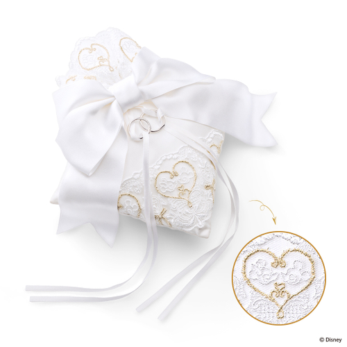 オリジナルレースを贅沢にあしらったリングピロー。仲良く向かい合うミッキーとミニーに特別な日の想いをこめて。