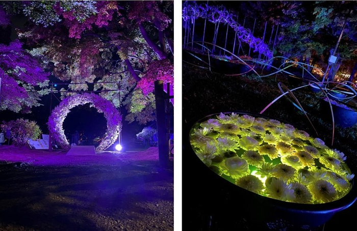 紅葉とお濠のビュースポットに菊舟を浮かべ、会場を鮮やかに演出します。