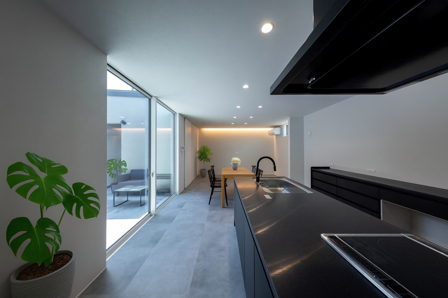 本モデルハウスで目指した室内空間は「スタイリッシュモダン」です。床には、モルタル柄のフロアタイルを採用。巾木(壁と床の境目に設置する部材)は通常60mmのところをわずか9mmとし、ホワイト塗装を施しています。窓枠も見えないように工夫をしたりとディティールにこだわったモデルハウスです。