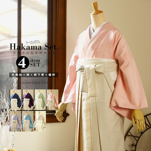 卒業式、修了式に出席される教職員のための上品な装い。色無地の着物と袴、袴下帯、襦袢の4点セットを販売開始。コーディネート済だから安心。着物は8色、無地袴、ぼかし袴、刺繍袴の3種類から選べます。サイズはS、M、L、TL、LL。