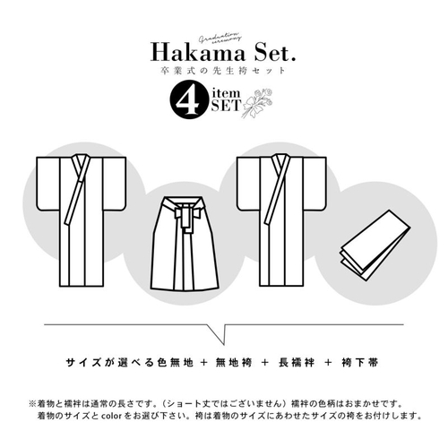 【商品内容】サイズが選べる色無地・無地袴・襦袢・袴下帯の4点セット