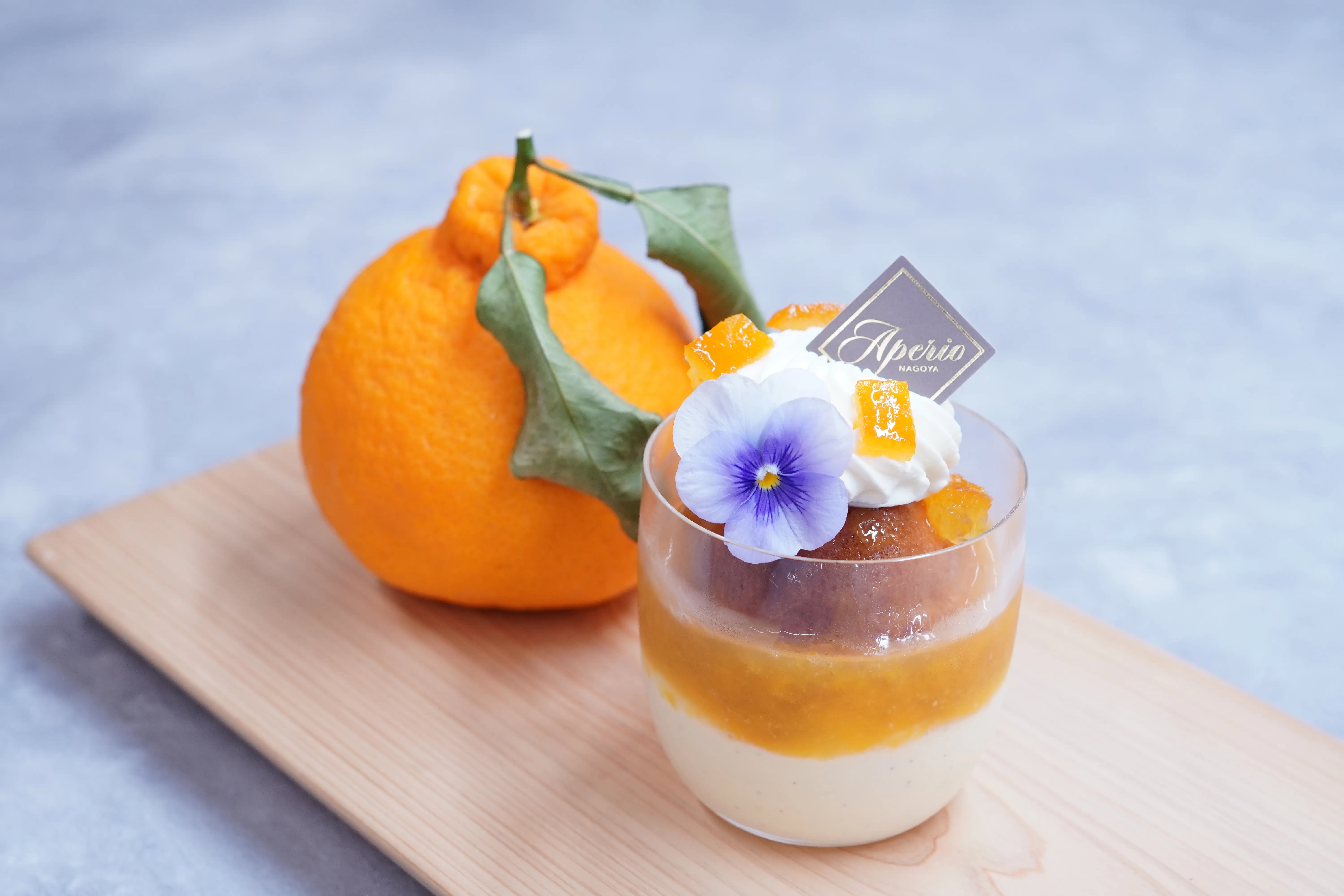 樹上で熟した甘く、香り高い愛知県蒲郡産の樹熟デコポンを贅沢に味わえるサヴァラン。甘い実はジュレに、皮は風味を残しながら自家製でコンフィに仕立てます。サヴァラン生地はこのコンフィを練り込んで焼き上げ、付け込むシロップにはコンフィを作るときにできたデコポンのエキスが詰まったシロップを使い、樹熟デコポンを余すところなく使用。できあがったサヴァランにはカスタードクリーム、デコポンのシロップとホワイトラムのアルコールで付け込んだサヴァラン生地、デコポンのジュレ、乳風味が豊かな北海道産の生クリームをのせました。