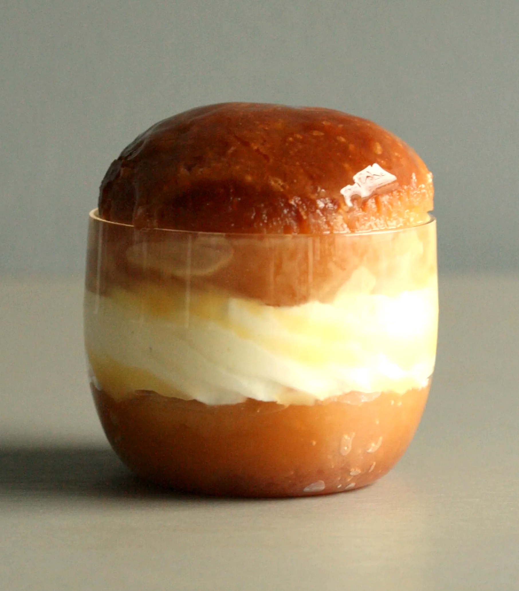 春先に完熟した香川県産レモンのレモン果汁をしょうがに加えた出汁に浸し、しっかりと焼き上げたブリオッシュ生地にレモンのクリームとシャンティ、カスタードクリーム、レモンのコンフィ、リモンチェロで組み立てました。夏らしく軽やかにみずみずしい食感にフルーツ酸が美味しい夏のお菓子です。