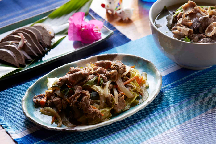 西表島では、カマイが増えすぎないように、冬の期間限定で狩猟を解禁しています。自然の恵みに感謝しながら、その地域で、その季節に獲れたものを食べることも、生物多様性の保全に一役買っていることを体感できます。島の食堂で、「カマイのチャンプルー」や「カマイ汁」など、島で親しまれている食べ方で、カマイをいただきます。