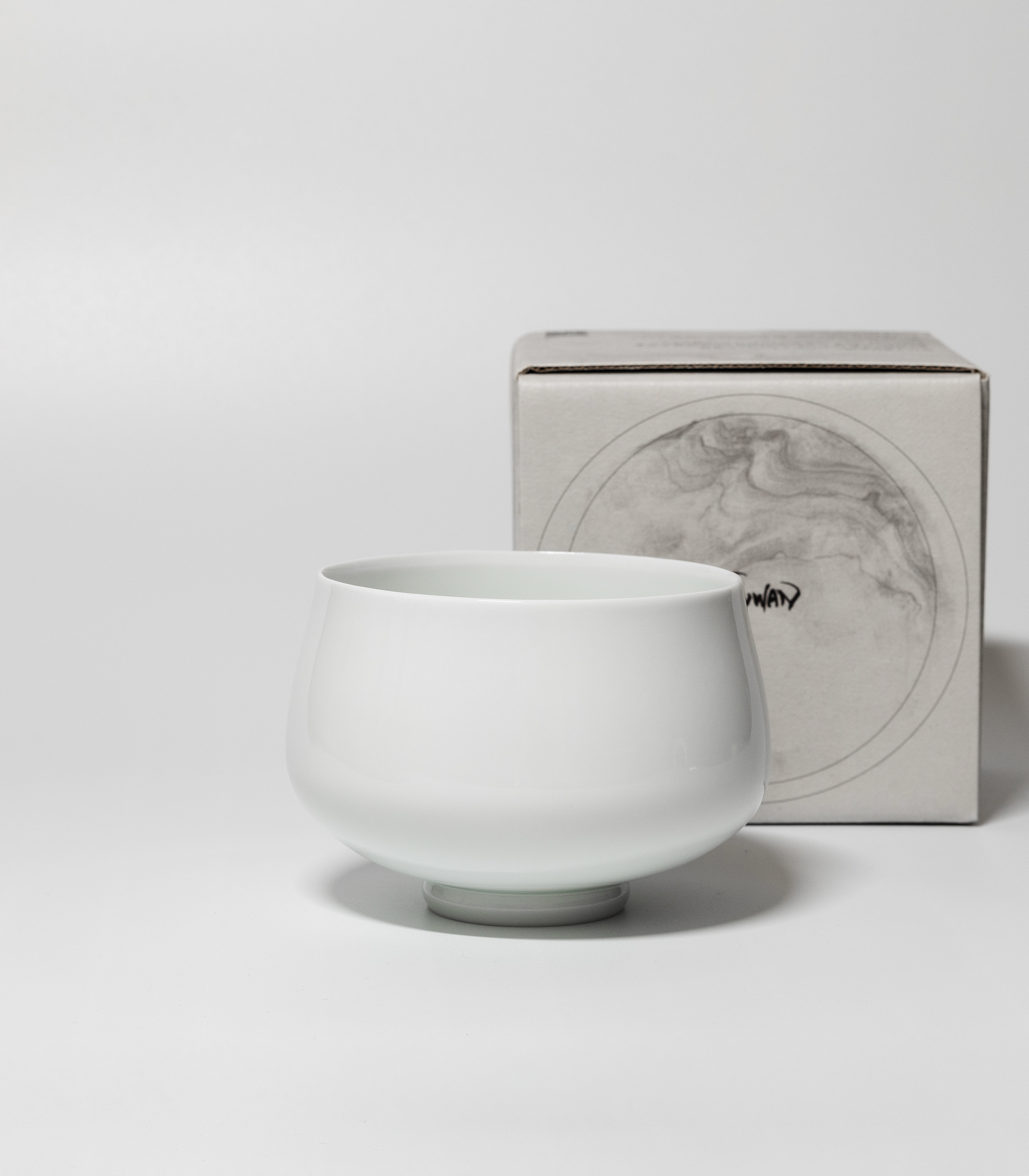 SHUWANの酒器は、口縁から胴の最も張り出した部分にかけて徐々に広がり、そこから高台に向かっては徐々に絞り込まれるように形成されています。また、真上から見たときには、口縁部はほぼ円形を描く一方、胴の張り出し部分は楕円形を描く構造となっており、円形と楕円形が器の中に併存する独自のフォルムを特徴としています。