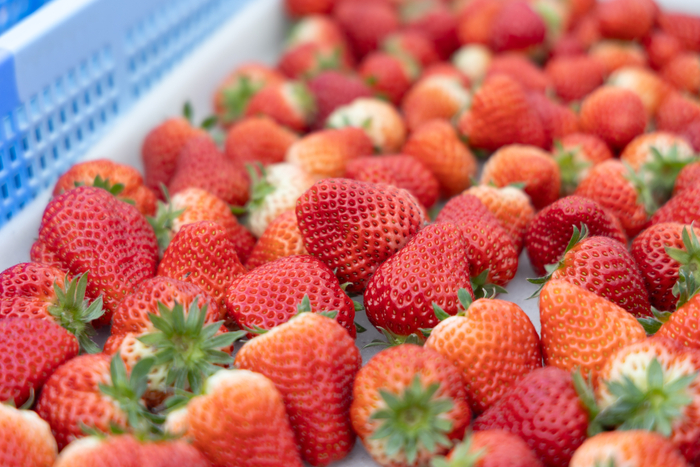 代々いちご農家だという代表の佐藤さんは、「いちごの鮮度が良い状態でお客様に食べてほしい」と、できるだけハウスの中でいちごを熟成させることを心がけているそう。ハウスではスタッフがひと粒ひと粒手作業で収穫し、大きさなどを丁寧に選別、お客様へ届ける準備が行なわれています。