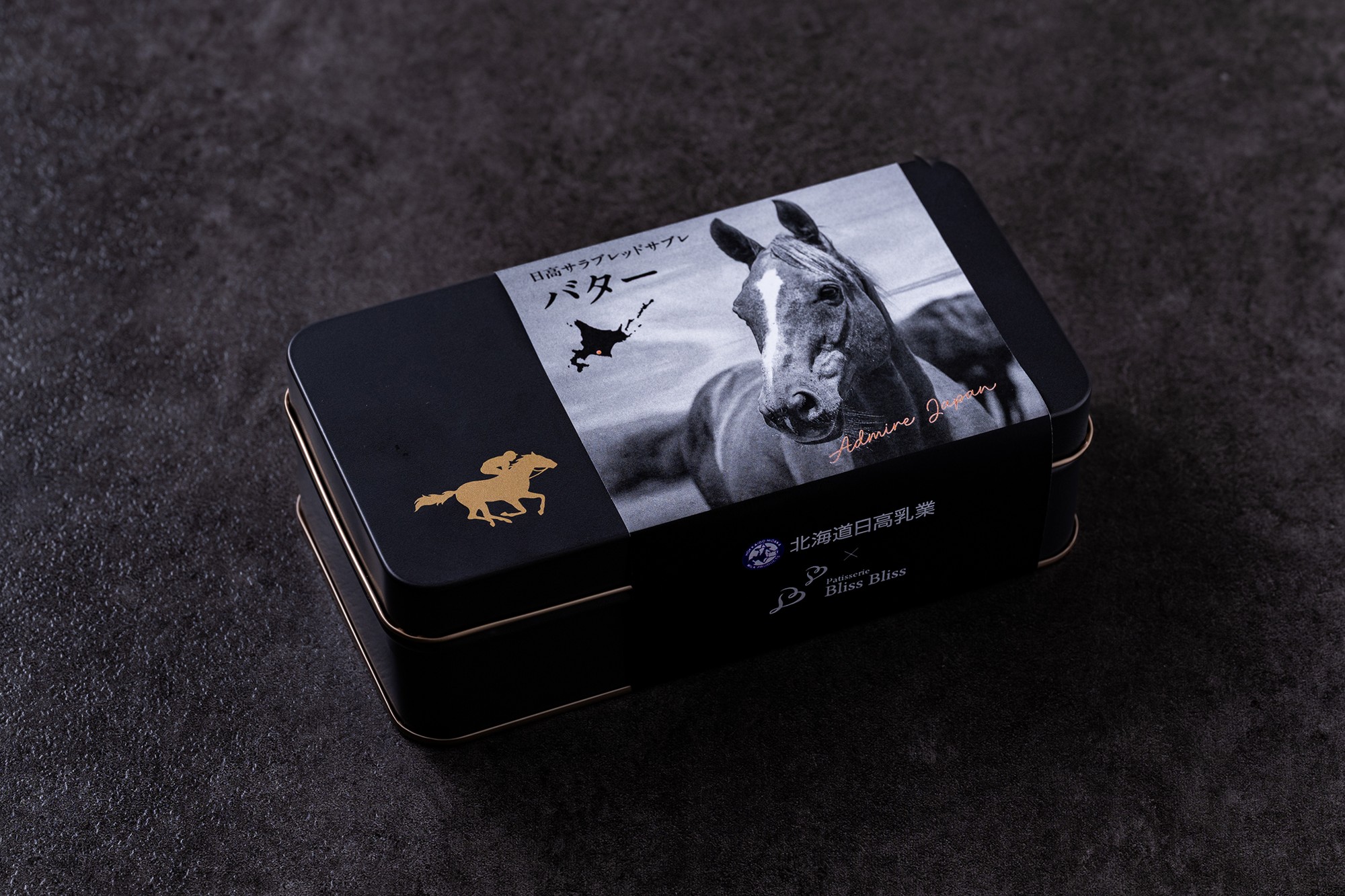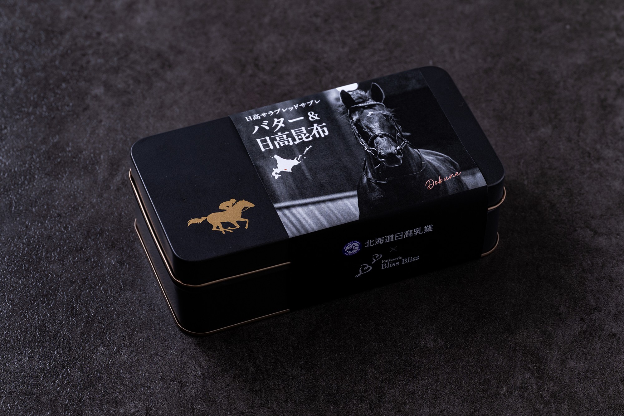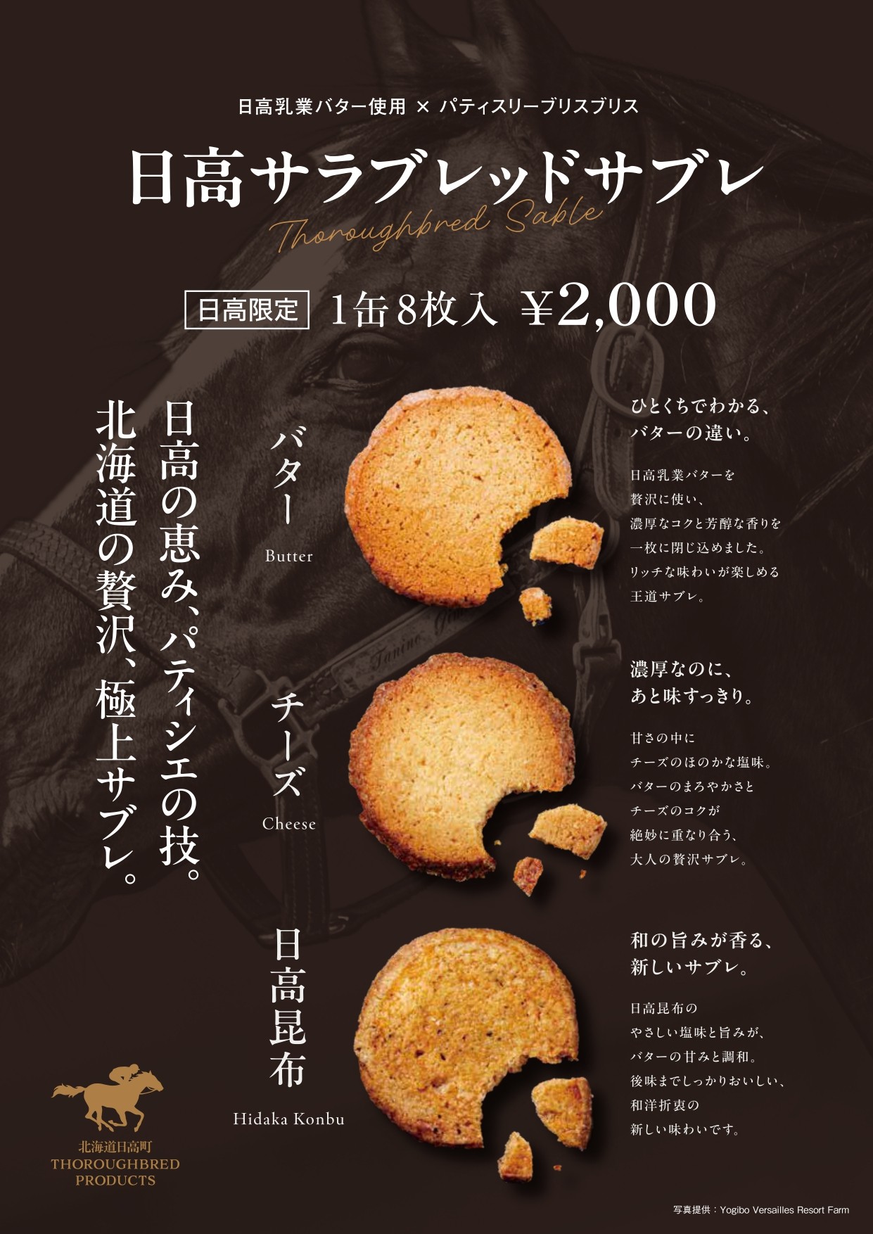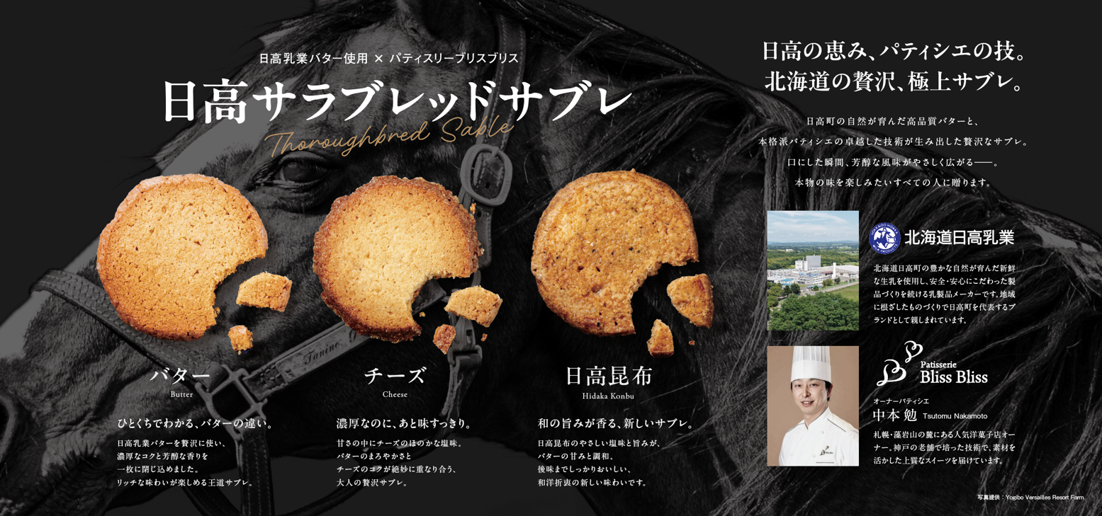 日本有数の馬産地であり、門別競馬場がある日高町の特色を活かし、力強く美しい競走馬「サラブレッド」をモチーフにしたオリジナルパッケージのサブレです。パッケージの写真は日高町内の引退馬牧場「Yogiboヴェルサイユリゾートファーム」から提供いただきました。商品名も「サラブレッド」と「サブレ」を掛け合わせ、地域への想いを込めています。