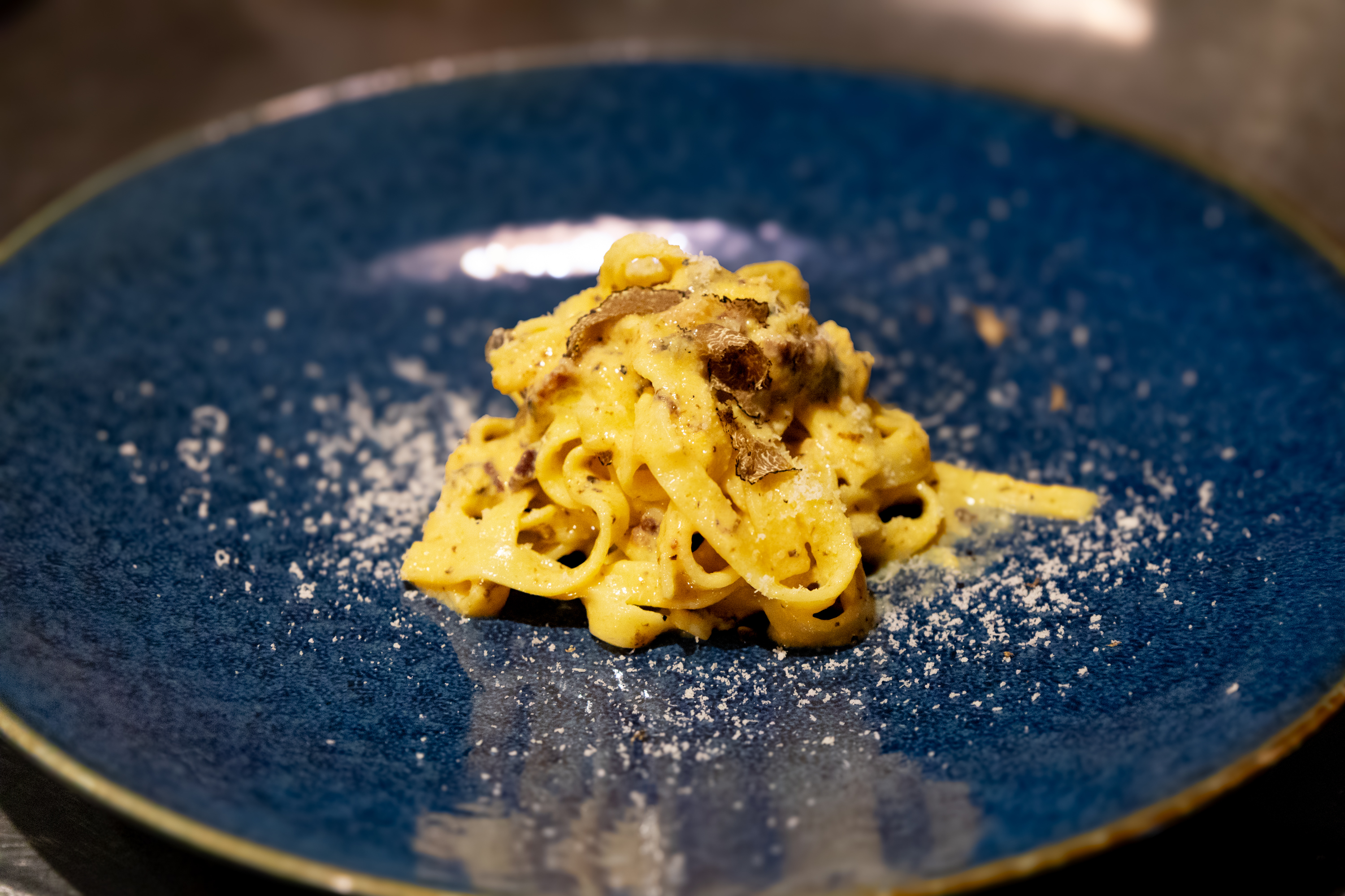 ベーコン、パルミジャーノ、黒白トリュフの共演“香りの爆発”。プレミアムだけの白黒ミックス仕立て。