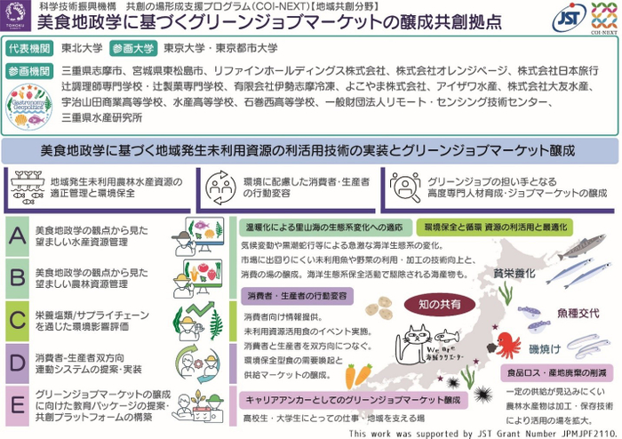 2021年11月からスタートした、国立研究開発法人科学技術振興機構(JST)「共創の場形成支援プログラム」(COIーNEXT)の令和3年度採択プロジェクト。本プロジェクトで提唱した「美食地政学」という新たな概念に基づき、地域資源の適切な管理と利用技術を確立することにより、人々のライフスタイルが温暖化による気候変動や、黒潮蛇行などによる海洋環境変化に適応し、食品ロスや産地廃棄が最小化される社会を構築。また生産地のみならず、都市部の消費者にもこの概念を伝えることで、消費者の価値観の転換を促し、食にまつわる持続可能な新たな社会の構築を目指す。さらに、地域の若い世代にとって魅力のある地域グリーンジョブマーケットが醸成された持続可能な社会を目指す。