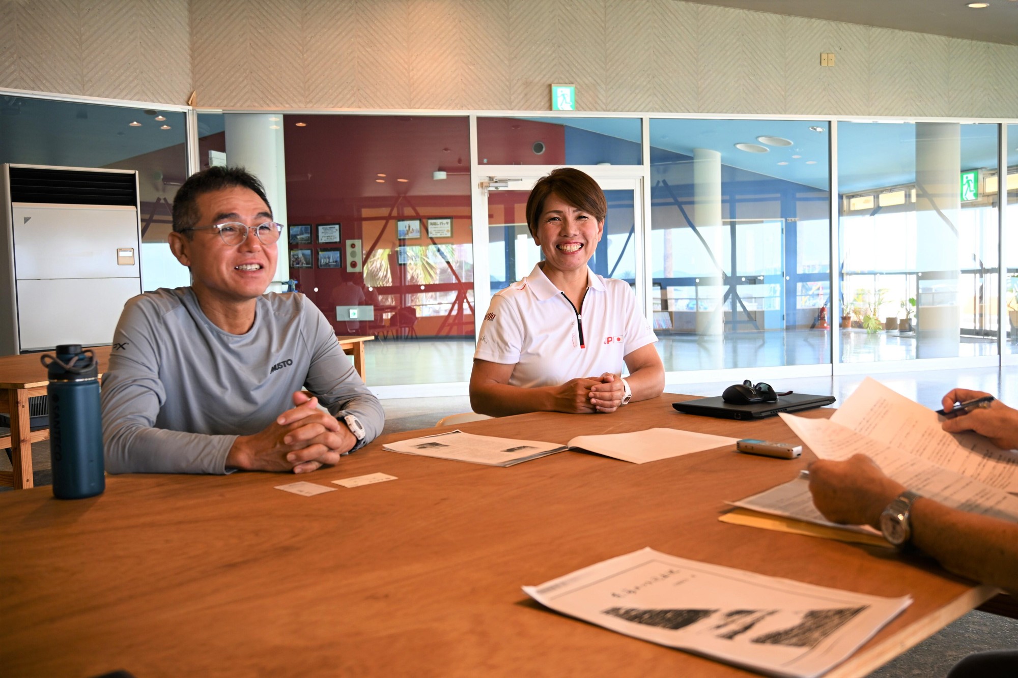 取材を受けるヨット部監督の杉浦啓之さん(写真左)と森さん