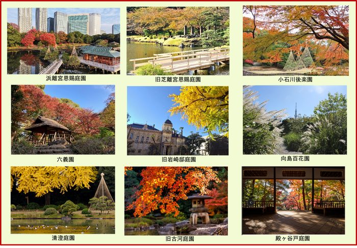 浜離宮恩賜庭園(中央区)、旧芝離宮恩賜庭園(港区)、小石川後楽園(文京区)、六義園(文京区)、旧岩崎邸庭園(台東区)、向島百花園(墨田区)、清澄庭園(江東区)、旧古河庭園(北区)、殿ヶ谷戸庭園(国分寺市)