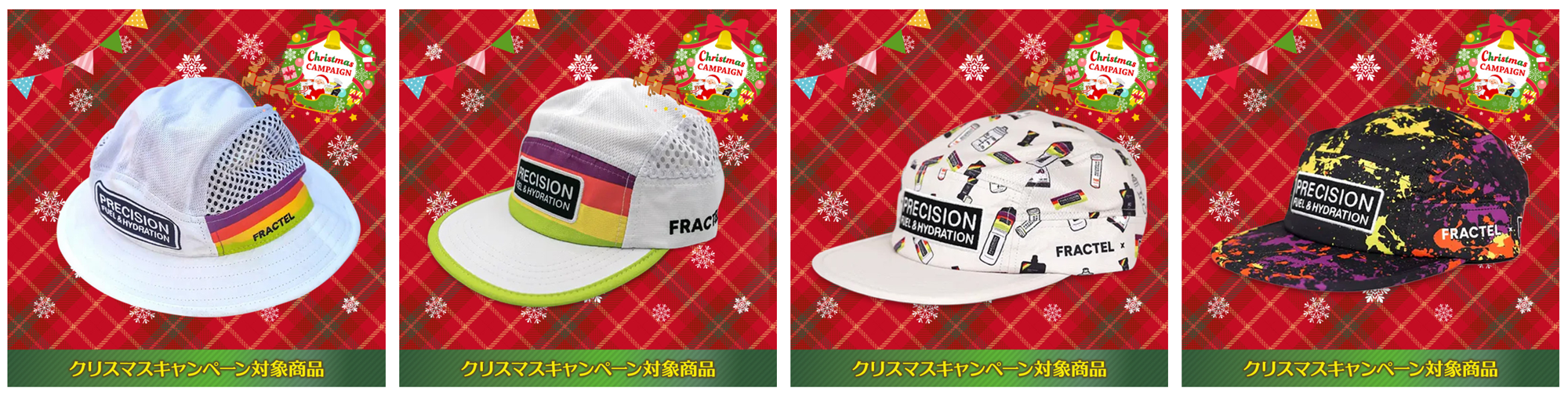 キャンペーン期間中に、当社ECサイトにて、「ハット・キャップ」をご購入の方に、もれなく「完走セット1(クリスマス仕様)」+「PH500パウダー」2袋をプレゼント! ※オリジナルクリスマスカード付