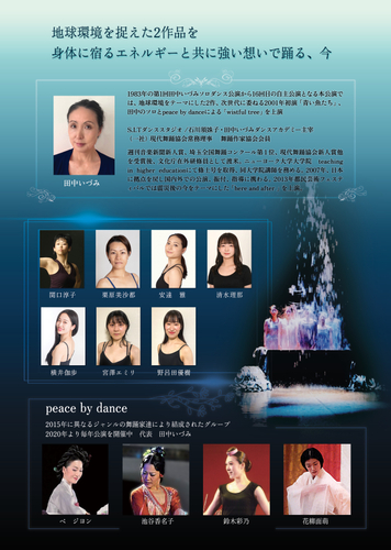 身体に宿るエネルギーと、地球環境に対する強い想いを踊る、今。「青い魚たち」は次世代に委ね、「wistful tree 」は田中いづみのソロと、5つの異なる舞踊ジャンルにより結成されたグループpeace by danceにより上演。