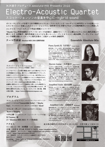 Absolute-MIX実行委員会主催、ピアニスト矢沢朋子プロデュース『Absolute-MIX presents Electro-Acoustic Quartet』が2022年11月22日(火)に吉祥寺スターパインズカフェ(東京都武蔵野市吉祥寺本町1-20-16 B1)にて開催されます。