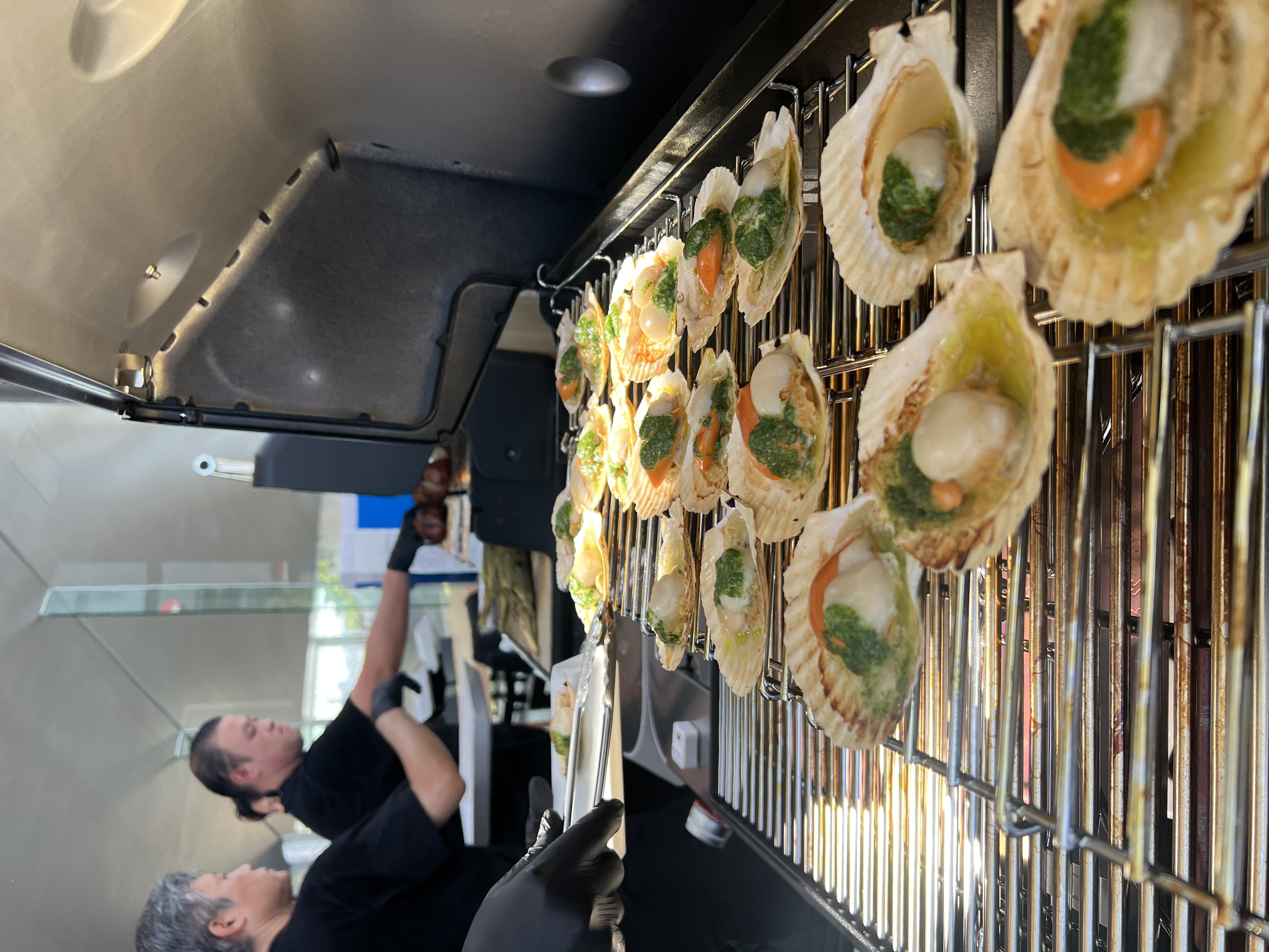 店舗スタッフは調理やオペレーションの確認を行い、来場者は大きなBBQグリルで焼き上げられる海鮮や野菜、三田ポークの塊肉をスマートフォンで熱心に撮影するなど、和やかな雰囲気の中で料理を味わいました。