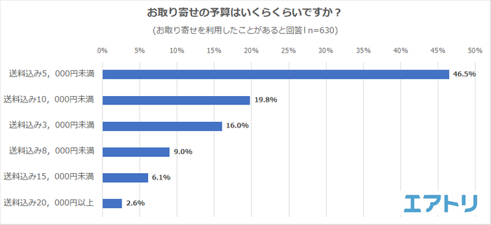 お取り寄せの予算について、1位は「送料込み 5,000 円未満」(46.5%)と回答した人が最も多く、2 位とは26.7 ポイント差と大きく差を付けました。2 位は「送料込み 10,000 円未満」(19.8%)、3 位は「送料込み 3,000円未満」(16.0%)と高額過ぎず、でもいつもより少し贅沢というような価格帯が人気のようです。