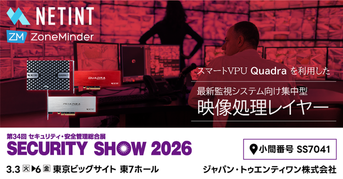 ジャパン・トゥエンティワン株式会社(本社:愛知県豊橋市、以下:J21)は、2026年3月3日(火)~6日(金)に東京ビッグサイトで開催されるセキュリティ・安全管理総合展「SECURITY SHOW 2026」において、ネットイント社(NETINT Technologies, Inc.、本社:カナダ)のスマートVPU「Quadra」を活用したセキュリティ映像ソリューションを展示します。