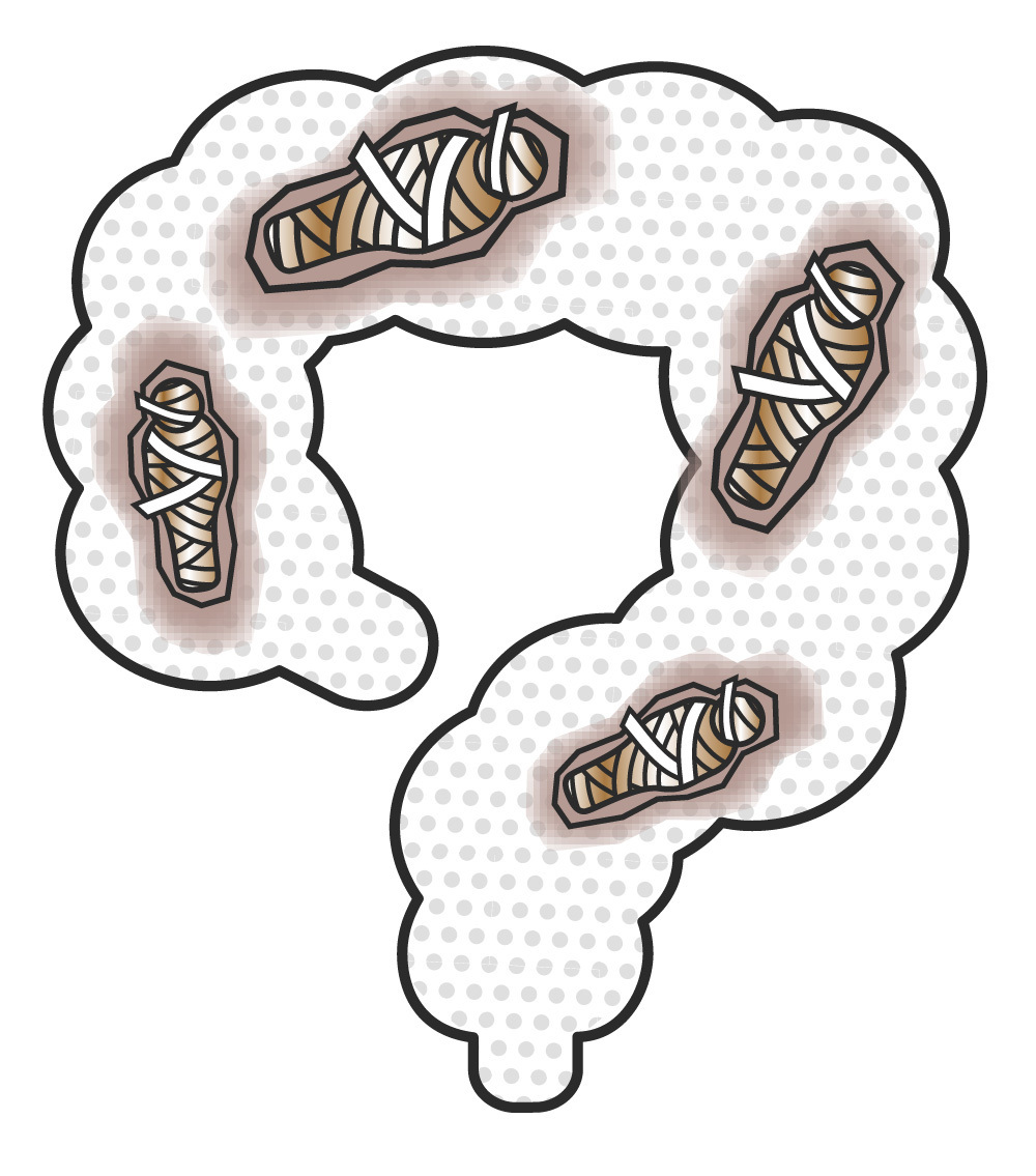 便秘の症状がある人はシニア層に多い傾向がありますが、今回の調査でも「便秘気味になり始めた年代は50代以降から」という人が多く見られました。加齢に伴う腸の動きの悪化に加え、筋力の低下が、残便感や排便時間の長さをもたらしているものと考えられます。便秘の人に多く見られる「コロコロ便」「硬い便」「やや硬い便」は、大腸に長く留まったために水分が搾り取られ、ミイラ化した便=“ミイラ便”になっている証拠です。この“ミイラ便”は腸内で硬く固まっているので、体内から排出するのもひと苦労です。便やおならが臭く感じるのは、ミイラ便が体内で腐敗し、毒素を出していることが原因と考えられています。