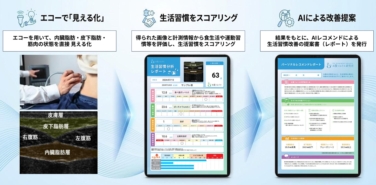 「お腹ソムリエ」は、エコーを用いて内臓脂肪・皮下脂肪・腹筋状態を可視化し、生活習慣リスクを数値化する未病評価サービスです。医療行為ではなく企業内イベント形式で実施可能であり、健康診断では見えにくいリスク層の抽出と、行動変容のきっかけづくりを目的としています。