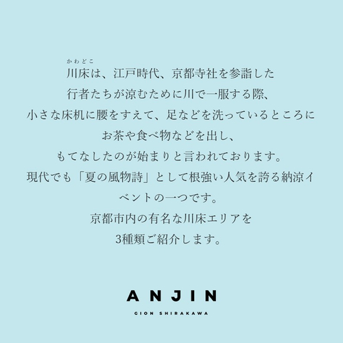 ◆ANJIN GION SHIRAKAWA presents 夏の風物詩・京の川床3選◆ 株式会社ジェクトワン 2021-08-04 12:00 いよいよ真夏日になってきた今日この頃、京都らしい納涼文化である川床(かわどこ)をご紹介いたします。 清流に面して、客席が設けられ、涼やかな水の流れを楽しむ京都らしい粋な文化です。 ANJIN Gion Shirakawaの目の前に流れる白川の清流だけでなく、ちょっと一足遠出してみてはいかがでしょうか。 ジャンル: 旅行・お出かけ ライフスタイル タグ: 京都 京都旅行 川床 鴨川納涼床 画像一覧 一括ダウンロード