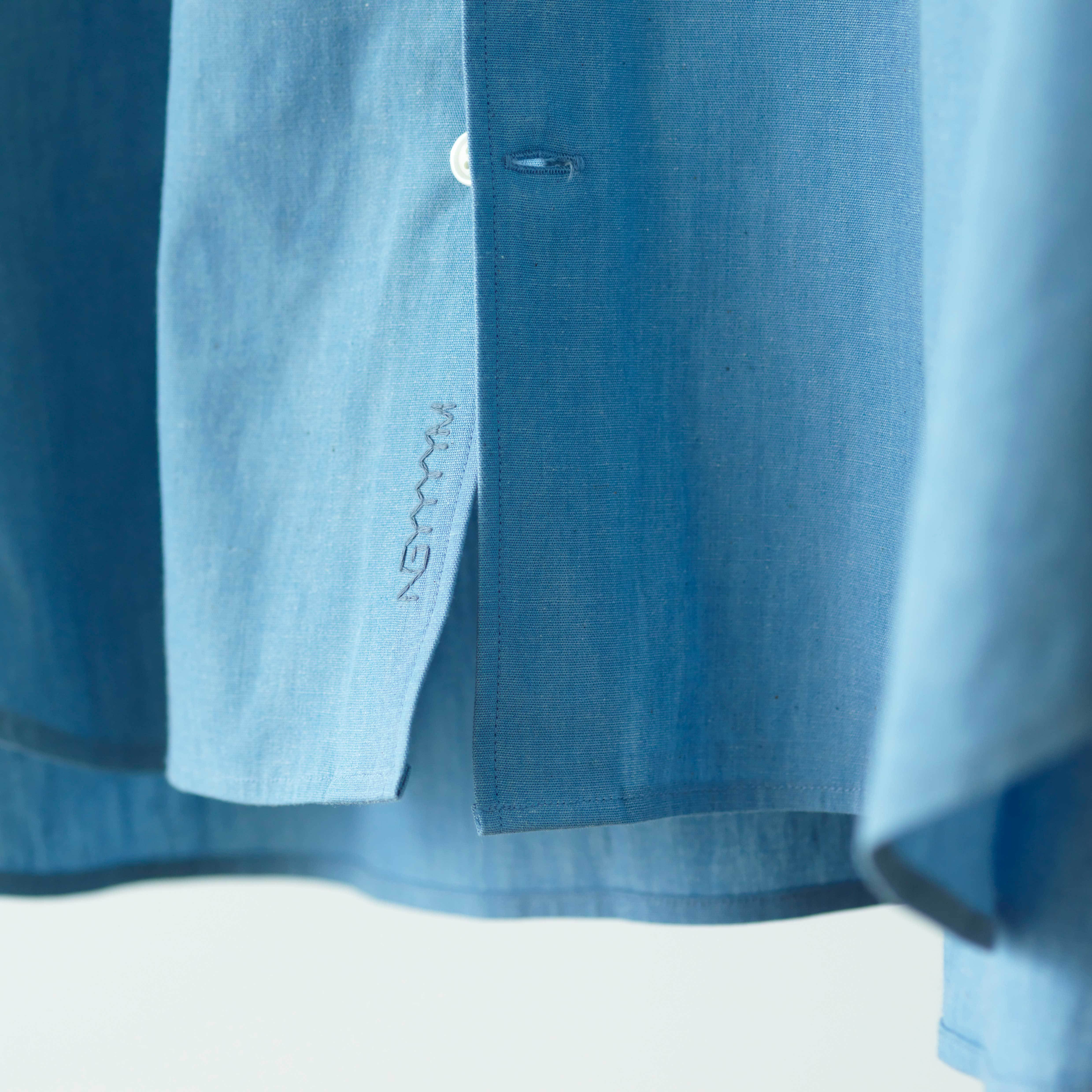襟の形状は特にこだわり、通常では珍しい縦長のネックラインが特徴で、その効果で上までボタンを留めてもビジネスライクにならずに抜け感が演出出来る絶妙なラインを再現しました。また女性が襟を抜いて着ても様になるという、ユニセックスにデザインされた秀逸なディテールが繊細なムードを醸し出してくれます。