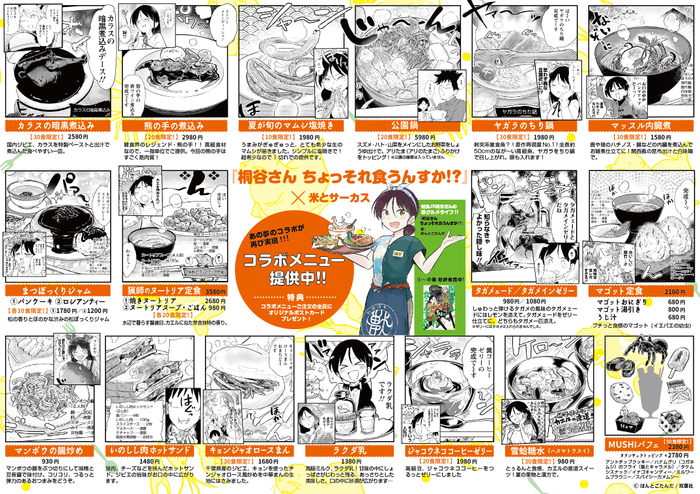 5月21日発売の『漫画アクション』にて連載第100回を迎えたことを記念し、作中に登場した「カラスの暗黒煮込み」「夏が旬のマムシ塩焼き」「まつぼっくりジャムパンケーキ」「猟師のヌートリア定食」「熊の手の煮込み」「ジャコウネココーヒーゼリー 」など計22品を米とサーカスで再現しました。