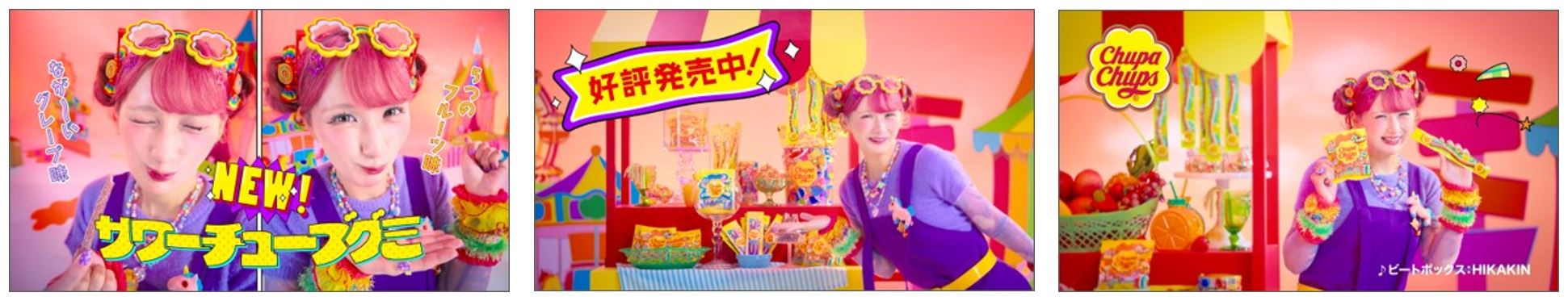 新CMでは、チュッパチャプスの楽しい世界感の中に、しなこさんがカラフルな衣装で登場。HIKAKINさんのビートボックスをBGMにしたポップで楽しいカラフルな世界で、見るとクセになるCMです。また、チュッパチャプスのグミを「たのしみチュくす」WEB動画では、しなこさんとHIKAKINさんがサワーチューブグミを使ってコーデチャレンジをするなど、思わず真似したくなる楽しい動画も公開いたします。