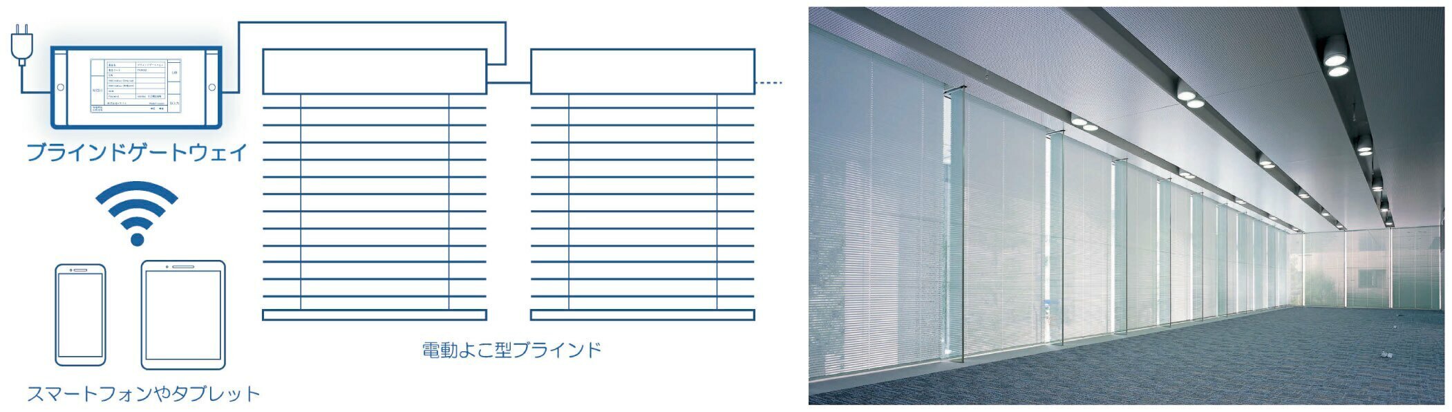 オフィスや商業施設では働く環境の快適性向上へのニーズが高まり、窓まわり商品のスマート化を望む声が増えています。これらのニーズにお応えすべく、Wi-Fi※接続可能なスマートフォンやタブレットから操作を可能とする「ブラインドゲートウェイ」を発売。離れた位置にある壁面コントローラーやリモコンを操作する必要がなくなり、オフィスや商業施設の快適性向上に貢献します。