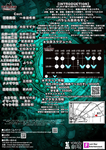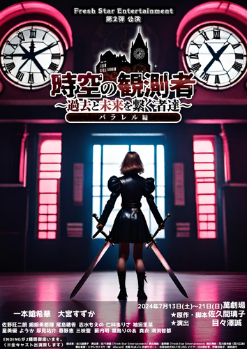 Fresh Star Entertainment(東京都板橋区)主催、『時空の観測者 ~過去と未来を繋ぐ者達~パラレル篇』が2024年7月13日 (土) ~2024年7月21日 (日)に萬劇場(東京都 豊島区 北大塚 2-32-22)にて上演されます。