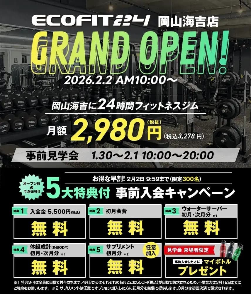 「エコフィット24 岡山海吉店」では、グランドオープンを記念して、先着300名様限定の入会キャンペーンを実施します。