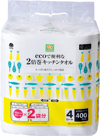コロナ禍以降、内食需要の増大や衛生意識が高まり、キッチンタオルの売上が伸長しております。この度新発売した「ecoで便利な2倍巻キッチンタオル」は1ロール100カットで、従来品の「スマイルライフ キッチンタオル(1ロール50カット)」の2倍巻となっているため、収納スペース・買い物回数・交換回数を削減でき、大容量なのにコンパクトな仕様となっております。また、芯や包装フィルムなども削減でき“eco”な商品です。