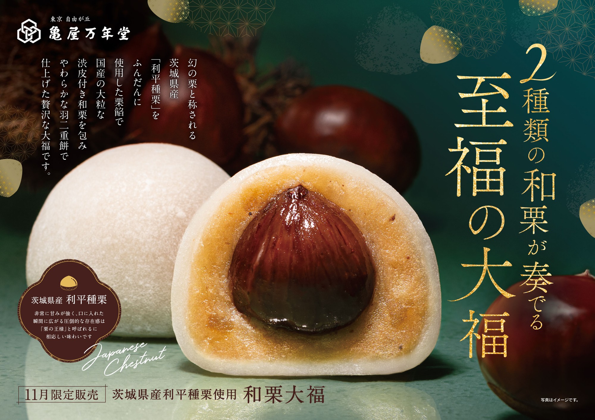 11月は、幻の栗と称されている茨城県産「利平種栗」と大粒の国産渋皮付き和栗を贅沢に使用した『和栗大福』(1個388円(税込)・常温販売)を直販17店舗(東京・神奈川)にて販売いたします。2種類の栗を贅沢に使用し、やわらかく伸びの良い羽二重餅で包みました。この時期だけの贅沢な秋の味わいをぜひお楽しみください。