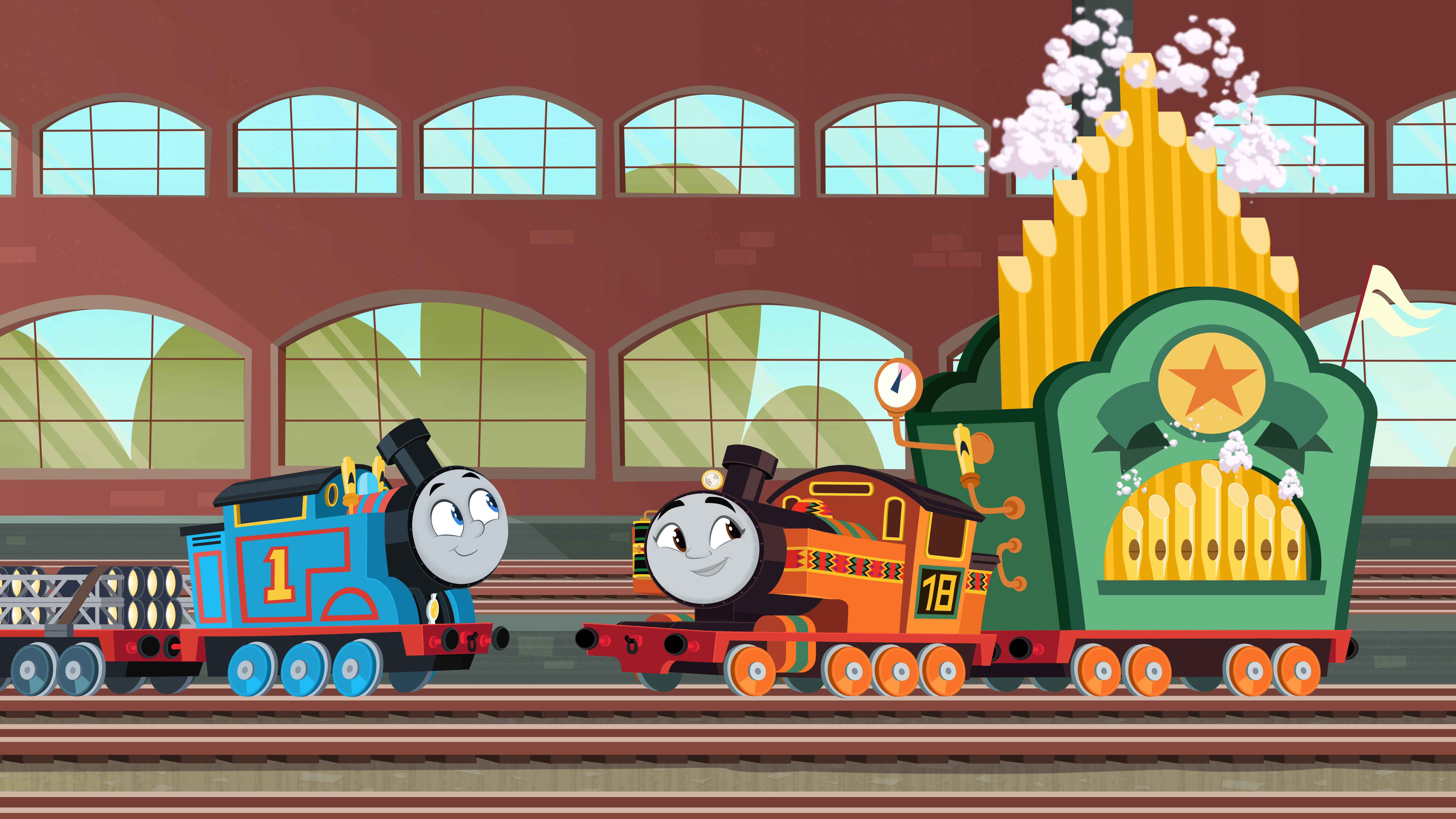 ソドー島の賑やかな音楽祭を背景に、「歌で心と心をつなぐよ」というキャッチコピーのもと、トーマスと、ケニア出身で音楽が大好きな女の子のタンク機関車ニアの歌声がソドー島に響き渡るような春らしいティザーポスターとなりました。同時に解禁された場面カットでは、トーマスたちが楽しそうに歌ったり、蒸気オルガンを運んだり、美しい音を出すクリスタルを見上げるなど、音楽がいっぱい。さらに、ティザー予告では、音楽祭に沸きたつソドー島で、島中の照明が壊れてしまうトラブルが発生し、トーマスと仲間たちが力を合わせて奮闘するドラマティックな仕上がりと
