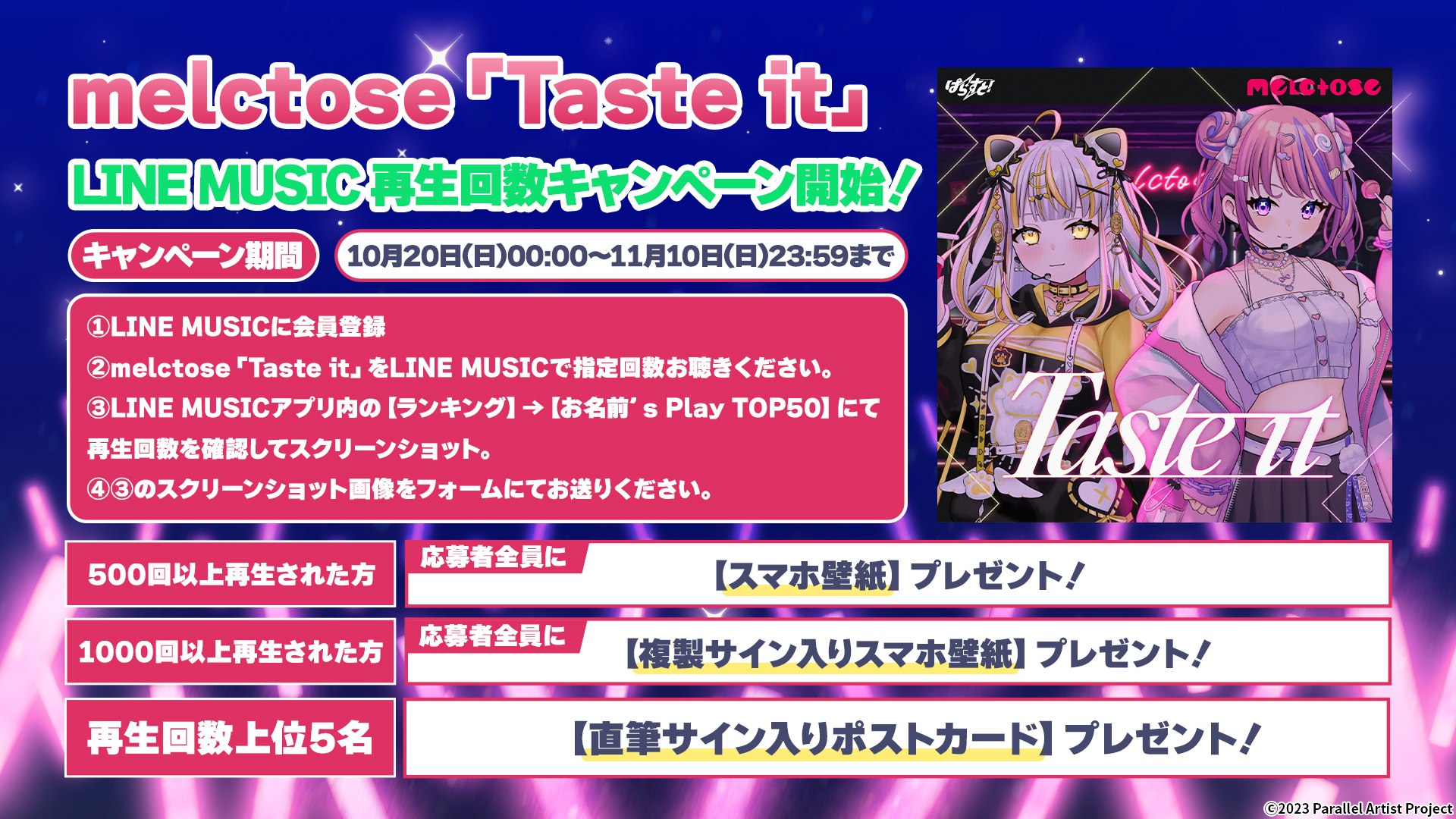 株式会社ClaN Entertainment(本社:東京都港区、代表取締役社長:大井 基行、以下ClaN)は、リアルとバーチャルでパラレルに活動するVTuberプロジェクト「ぱらすと!」のユニット「melctose(甘ヶ咲あめ、鈴神うたね)」から、初のオリジナル楽曲「Taste it」が10/19(土)にリリースすることをお知らせします。 「ぱらすと!」公式YouTubeチャンネルでのプレミア公開は10/19(土)19:00(予定)に、配信リリースは10/20(日)0:00(予定)となってますので、ぜひご視聴ください! 楽曲制作は大石昌良、Tom-H@ckらが所属する音楽制作会社F.M.F が担当し「市瀬るぽ」が楽曲提供 、楽曲描き下ろしイラストを「星宮あき」が担当! また楽曲リリースを記念して「LINE MUSIC再生回数キャンペーン」や日本テレビ「バズリズム02」内コーナ「あの人ランキング」でのMVオンエアもありますので、こちらもご注目ください。