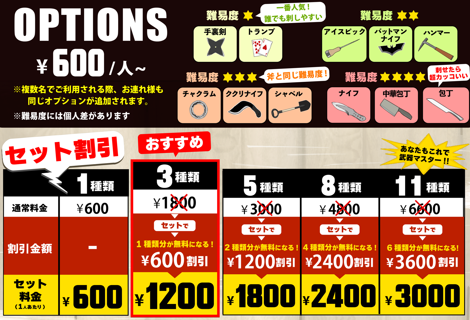"包丁"投げ放題とは、AXE THROWINGを提供してる対象の施設でオプションとして追加することができます。