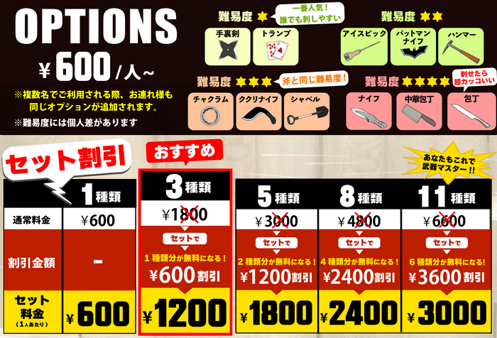 オプションは1種類600円となりますが、3種セット、5種セット、8種セット、10種セット、11種セットのセット割引を用意しています。