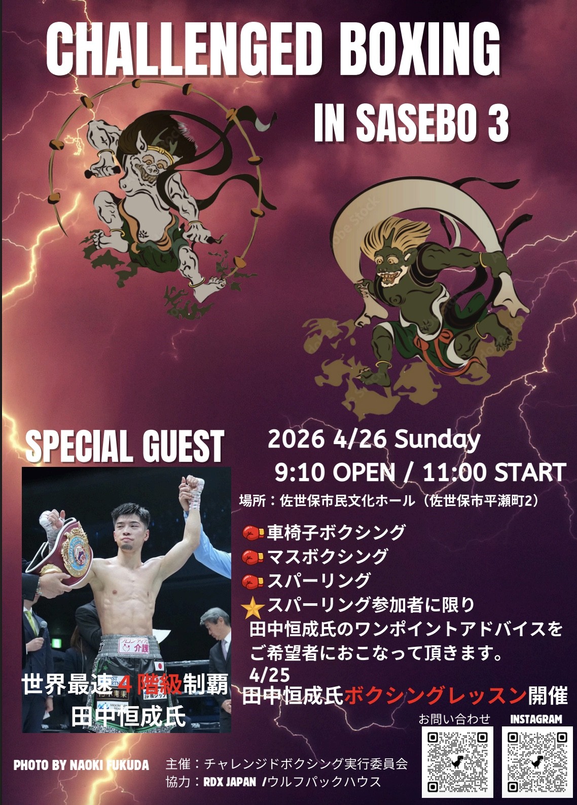 長崎県佐世保市で開催される注目の格闘技イベント「CHALLENGED BOXING IN SASEBO 3」は、車いすボクシングをはじめ、ボクシングレッスンなど、誰もが楽しめる多彩なプログラムが予定されています。本イベントの目玉は、元WBO世界フライ級スーパー王者で世界最速4階級制覇を成し遂げた田中恒成さんによるスペシャルボクシングレッスンとなっており、注目を集めています。このように障がいの有無を問わず、すべての参加者がボクシングの魅力を体感できる場となっており、スポーツを通じた共生社会の実現を目指しています。