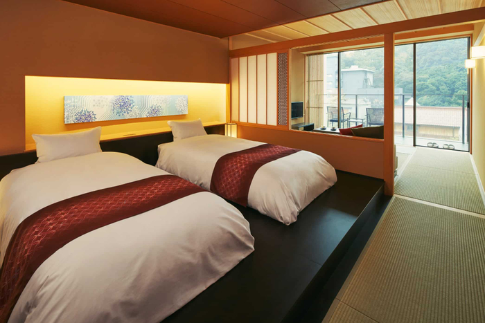 「九谷焼」「山中塗」「加賀水引」「加賀友禅」といった石川・金沢エリアが誇る代表的な4つの伝統工芸を随所に配した客室です。九谷焼の茶器でティータイムを楽しみ、山中漆器の壁掛けに加賀の文化を感じるひととき。障子にあしらった加賀水引が上品な輝きを放ち、ベッドルームでは加賀友禅をモチーフにしたパネルがおやすみ前の時間を優雅に彩ります。