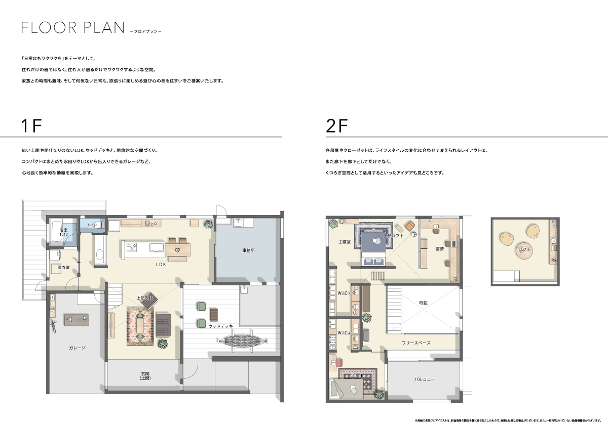 フロアプランでは「日常にもワクワクを」をテーマとして、住むだけの器ではなく、住む人が居るだけでワクワクするような空間。家族との時間も趣味、そして何気ない日常も、欲張りに楽しめる遊び心のある住まいをご提案いたします。